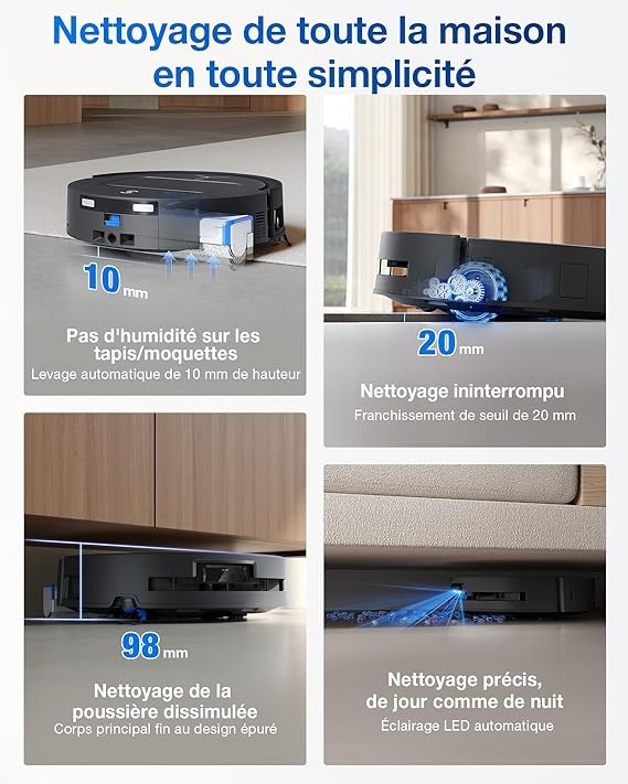 Le robot lui-même adopte une silhouette circulaire classique de 35 cm de diamètre, un format éprouvé qui facilite sa manœuvrabilité dans tous les espaces domestiques. Sa hauteur contenue de seulement 9,8 cm (tour LiDAR comprise) constitue l'un de ses atouts majeurs pour se faufiler sous la majorité des meubles bas, canapés, lits et radiateurs. Cette finesse verticale permet d'accéder à ces zones souvent négligées lors du ménage manuel où la poussière s'accumule insidieusement.