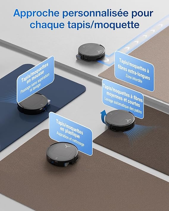 En mode lavage, le robot active la fonction "Priorité aux tapis" qui modifie radicalement sa stratégie. Il aspire d'abord tous les tapis à sec, puis les évite complètement lors de la phase de lavage pour ne pas les mouiller. Cette gestion intelligente garantit que vos tapis restent toujours secs et propres. Vous pouvez également personnaliser le comportement pour chaque tapis individuellement : aspiration uniquement, zone interdite, passage sans s'arrêter, ou traiter comme un sol dur. Cette flexibilité permet de s'adapter à toutes les configurations domestiques.