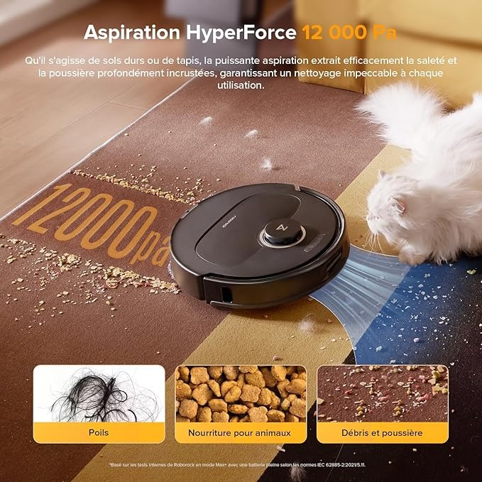 - Puissance d'aspiration impressionnante : les 12 000 Pa garantissent une capture efficace de tous types de débris, même dans les tapis épais